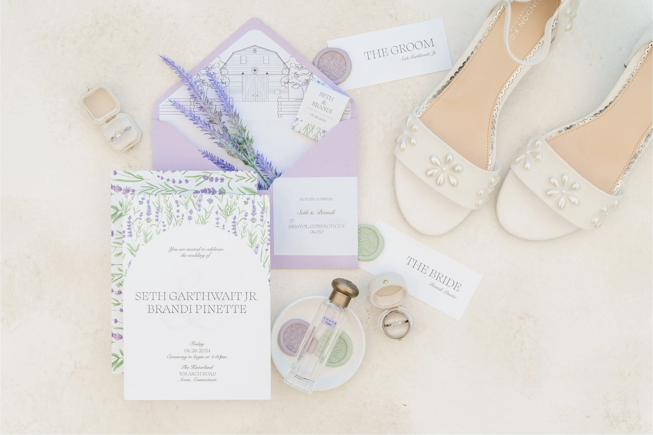 The color palette centered around lavender and sage green— our favorite colors— paired with linen cardstock, an envelope liner featuring an illustration of our venue, and matching purple envelopes.
